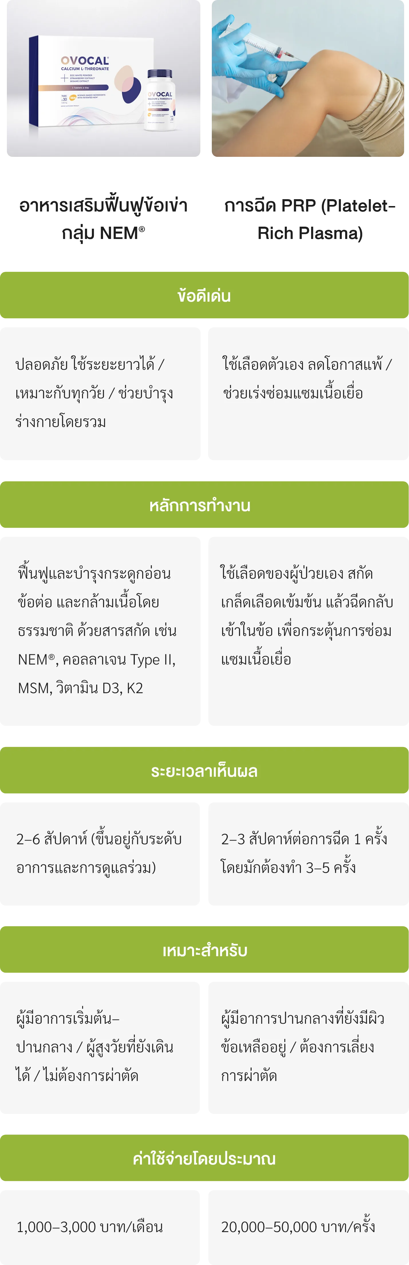 ตารางเปรียบเทียบแนวทางฟื้นฟูข้อเข่าเสื่อม