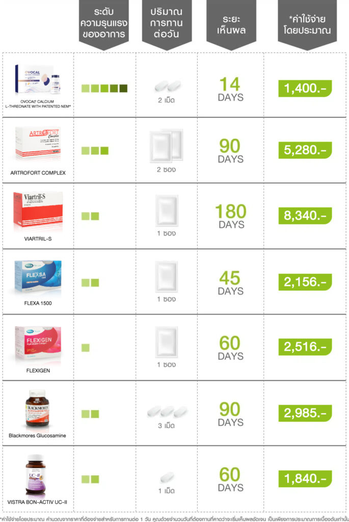 - ป้องกันข้อเข่าเสื่อม ทานวันละ 1 เวลา เช้า หรือ เย็น