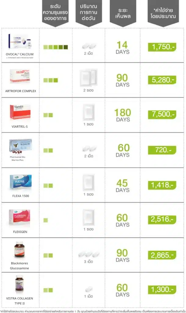 A: ทานได้เป็นประจำทุกวัน แม้จะหายปวดแล้ว เพื่อเป็นการป้องกันและเสริมสร้างความแข็งแรงให้กับข้อเข่า เพิ่มน้ำเลี้ยงข้อเข่า เพิ่มความยืดหยุ่นให้เส้นเอ็น และเพิ่มกล้ามเนื้อรอบข้อเข่า