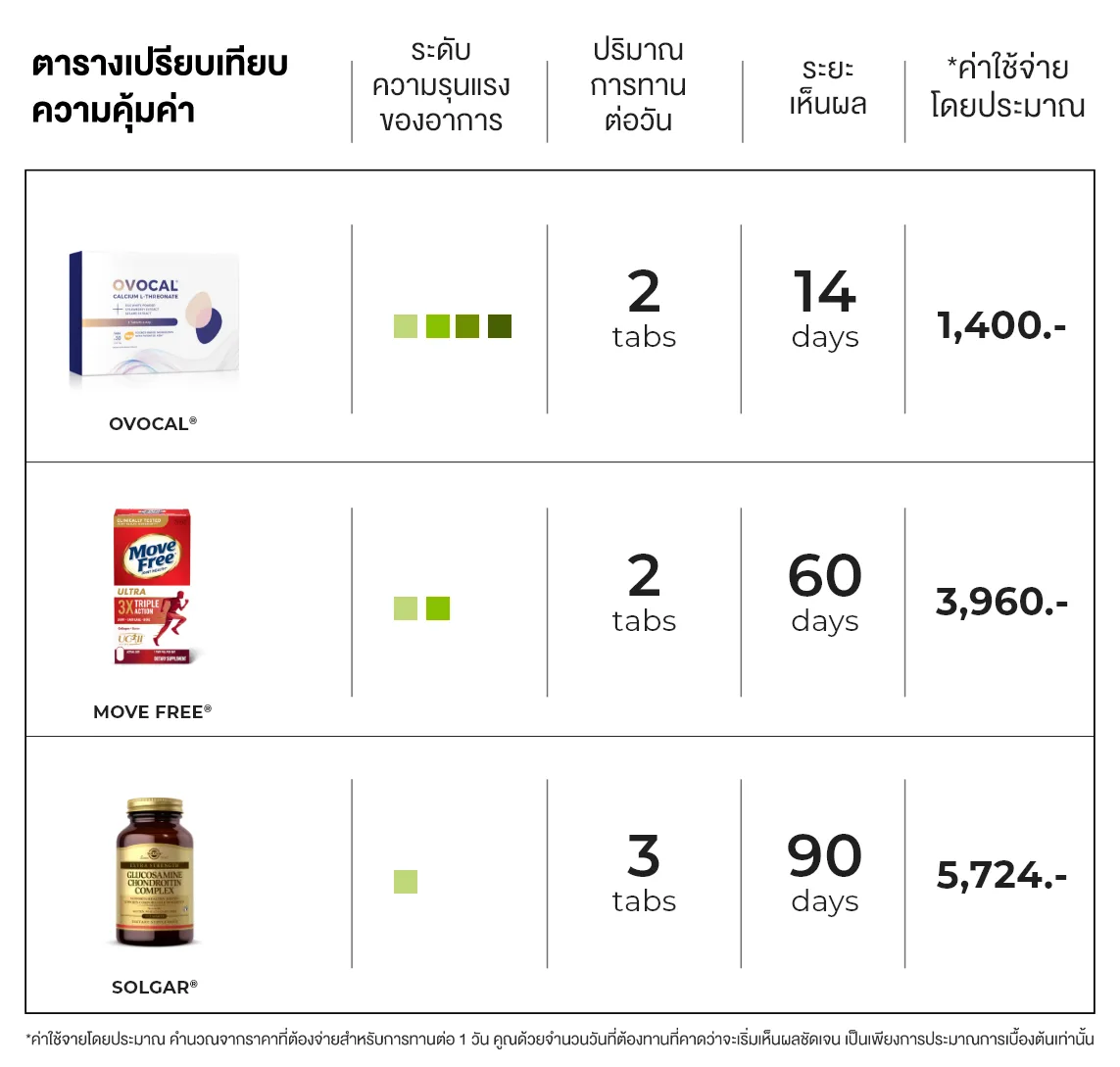 OVOCAL® เป็นนวัตกรรมใหม่ ที่เภสัช Vote ให้คะแนนเป็นอันดับ 1 ในเชิงประสิทธิภาพการฟื้นฟูกระดูกและข้อเข่าเสื่อม จากผลวิจัยพบคนไข้กว่า 85% เริ่มเห็นผลได้รวดเร็วใน 14 วัน เหมาะกับคนไข้ข้อเข่าเสื่อมระดับปานกลางถึงรุนแรง ซึ่ง การใช้ Collagen II หรือ Glucosamine อาจไม่เห็นผลดีเท่าที่ควร